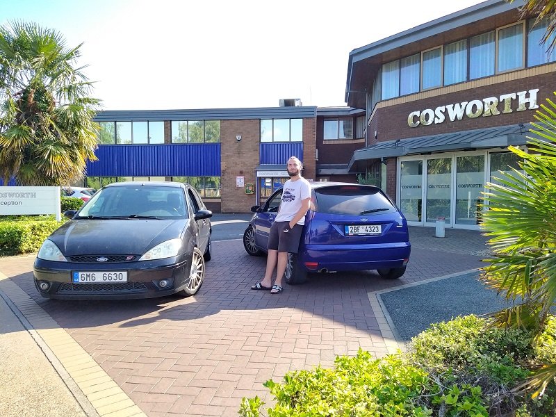 Sobota ráno - vyrážíme dle výše uvedeného seznamu na místa. Všechna dodnes fungují - kromě posledního - Andyho hala už má dávno jiného majitele a závodní vozy už se tu nějakou dobu nestaví. Když jsme přijížděli do Northamptonu k sídlu Cosworth, zaparkovali si to kluci přímo před hlavní vchod jako kdyby nám to tam patřilo. Nasměrovaly se auta a že uděláme vzpomínkovou fotku. Vždyť oba motory se přesně po 20-ti letech zase podívaly na místo činu. Byli jsme tak zaneprázdnění focením, že nám nedošlo, že jsme na cizím pozemku. Po chvíli vyšel vrátný - tak jsem mu šel naproti, abych mu řekl, že si chceme jen udělat pár fotek a hned zmizíme. No paradoxně jsem tu jedoducho uvětu trochu zamotal, tak jsem si česky odprskl " ty vole, tak ještě jednou " a vrátný se na mě podíval a pronesl: " Já rozumiem po česky, já som zo Slovenska " Tak ten mě docela uzemnil :mrgreen: Tak jsme prohodili pár vět, kdy mu bylo jasný, že jedeme na Ford Fair a ať si uděláme v klidu fotky a užijeme si to a šel azse odpočívat na vrátnici...Jaká je šance, že v anglii v sídle Cosworthu chytnete na vrátnici slováka? Následně přejezd do Coventry kde se ZAHRY spokojeně vyfotil u haly, minuta ticha a můžeme zpátky směr Silverstone.