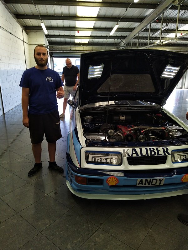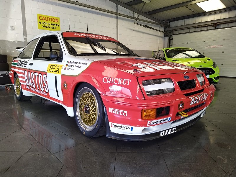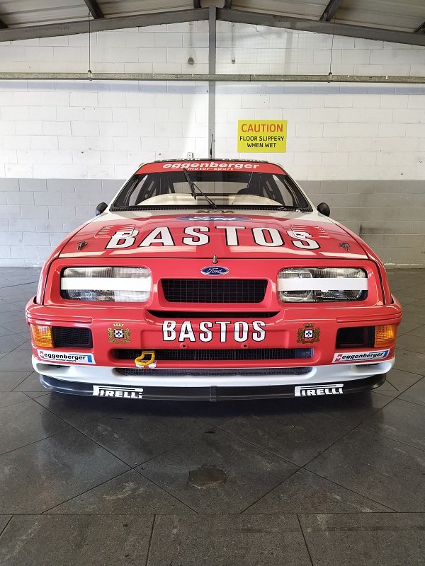 Už jsem v depu! Pro mě totální překvapení a vůbec vrcho celého Ford Fairu. Než jsem tam jel, tak jsem doufal, že někdy uvidím na živo Sierry RS500 Cosworth , ale nečekal jsem že uvidím mojí srdcovku v barvách Kaliber, kterou stavěl a pilotoval sám Andy Rouse, asi vůbec nejslavnější závodník BTCC. kousek od ní pro změnu Sierra RS500 Cosworth od Eggenberger jako jediná ( ikdyž původně samozřejmě černá ) ve světlých barvách Bastos, která vyhrála 24hodinovku na okruhu ve SPA, se kterou jezdil Gianfranco Brancatelli. Jedna z mála levostrancýh RS500. Za okny obou závodních legend papírky s pořadovým písmenem a číslem - takže budou jezdit na trati! K tomu ale později. Pro mě opravdu splnění snu. Stojím u Andyho Sierry a je zvláštní jí pozorovat. Byl to vůz ze sezóny 1989, který sice nebyl tak úspěšný jako ten v sezóně 1988, ale ne o moc. Na první pohled je poměrně dlouhá, až Vás zaskočí jak je úzká a nízká. Závodní verze už měla 17" kola na 3dílných křemíkových BBS ráfcích a pochopitelně na slickách. Byl jsem jako u vytržení, když mi majitel po otázce, jestli mohu nakouknout dovnitř spojeně řekl "Yes, of course" a mohl to vidět i zevnitř. To nejlepší na závěr - stojím přímo před motorem a jen žasnu. Dvoulitrový motor, dvě vačky, 4 válec a turbo T04 natlačené k 2,5 baru a výkon 560koní....Je prostě šílené, že s tím v dobách slávy dokázali jet 189 mph/h ... Okolo tohoto auta jsem stepoval nejvíc a něchtělo se mi od něj vůbec odcházet. Paradoxně, nakonec jsme se k němu vrátili ještě jednou, prostě u mě, to ani jinak nešlo:) Dalo by se v tu chvíli říct, že kdyby jsme po tomhle setkání museli už odjet, já bych odjížděl spokojený a klidný se spokojeným úsměvem!