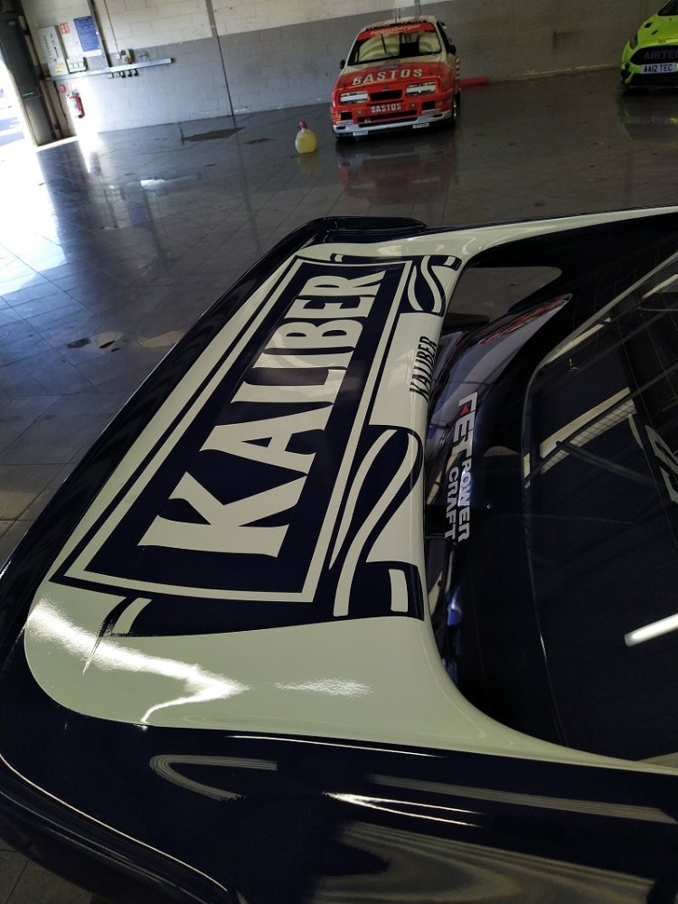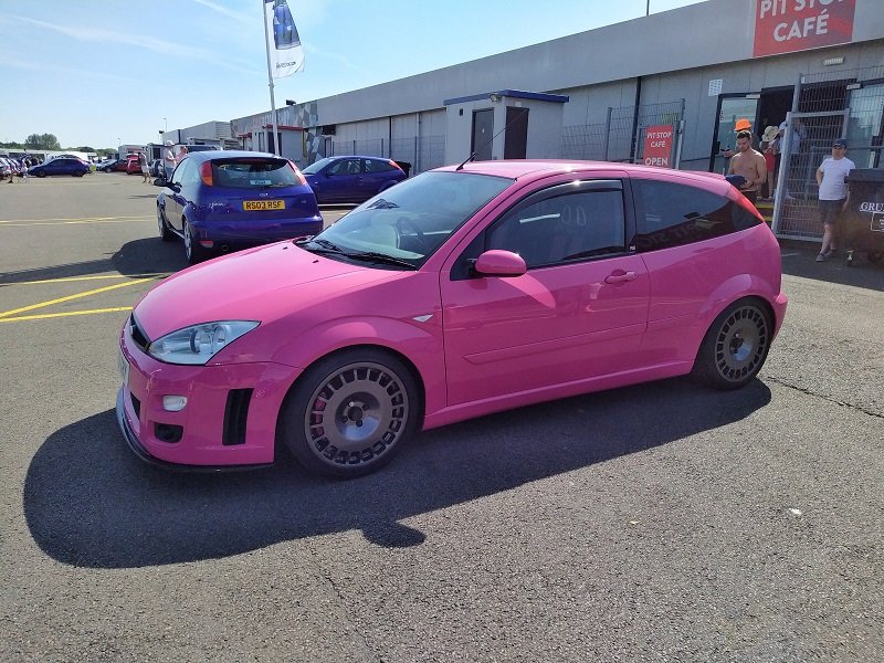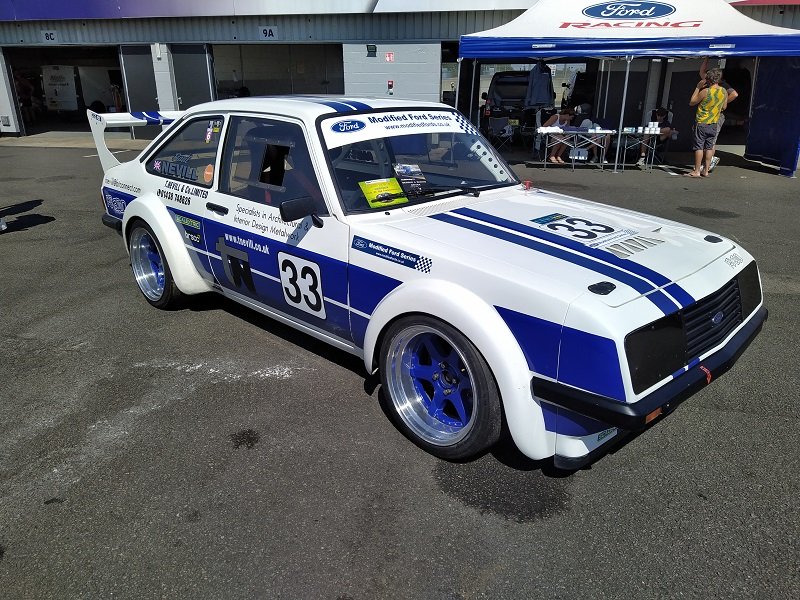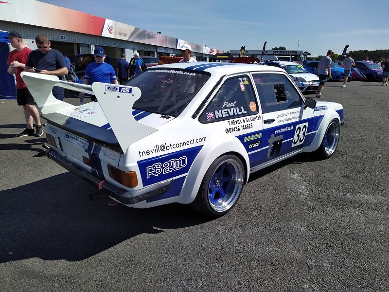 Na chvíli jsme se rozhodli, že si půjdeme sednout na tribunu, protože slunko sviňa pálí i v anglii a chtělo to trochu stínu a odpočinku. Takže jsme sledovali, co všechno se na dráze ukázalo a jaké to byly zvrácenosti. Sedíme a v podstatě to bylo dost často opakující se podívaná. Hromada Focusů RS MK2, Fiesty ST150, ST180 a ST200, občas něco hodně starého s nedobovým motorem :D a pak to přišlo. Rachot jako blázen a z ničeho a od nikud vyletěl Mustang GT4 zmiňovaný výše. Na tribuně na chvíli zavládlo ticho a pak ovace. Upřímně nepamatuju, kdy jsem viděl na okruhu něco tak rychlého, vážně rychlého a přesného. Zatáčky podél obrubníků to jelo jako z učebnice a bez výrazného zpomalení. V této jízdě se mihnul i bílý Escort RS Cosworth, obě auta byly kousek od sebe. Bylo vidět že se ho drží co může, ale Mustang kolo od kola zrychloval a každým kolem byl mezi nimi větší a větší rozestup. Ale celá tribuna musel vzdát hold, protože majitel Escortu byl asi naprostý srdcař. Do zatáček posílal Escorta za Mustangem na plný plyn tak, že jsem poprve viděl Escort RS Coswort jet smykem bokem a ještě po třech kolech na slickách :D Prostě palec nahoru!