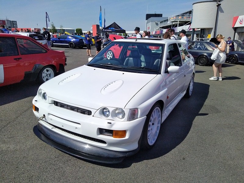 Vjíždíme dovnitř - ono se to fakt stalo! Jsme tady! Na zrcátku nám visí označení, kde budeme mít vystavené auto uvnitr mezi ostatními. Nedá se, než prostě uznat a smeknout, jak perfektně to bylo zorganizováno uvnitř. Hned si nás rozřadili, kam máme jet, takže během asi 3minut, jsme byli na svých místech. Prostě palec nahoru. Vzhledem k tomu, že jsme byli uvnitř, vůbec mezi úplně prvními, měli jsme výhodu, žádná fronta na jídlo, žádná fronta na wc. Takže jsme se uvelebili ke snídani, kdy mezitím, co jsme jedli jsme viděli na hlavní tepnu která vede na most přes část trati - takže všechno co příjíždělo dovnitř, nám jelo přímo před očima. Člověk by neměl přehánět a měl by vždy stát nějak soudně nohama na zemi, ale těžko se to popisuje, když to nevidíte každý den, respektive, když to nevidíte nikdy. Takže mezitím, co jsme jedli, kolem nás jezdily Fiesty a Escorty od prvních generací ve stavu těžko věřícím. Za ním přijíždí první Sierry...občas proletí Focus RS MK1, za kterým od nikud přiletí Escort RS Cosworth...po chvilce klidu a uklidnění všech turbodmychadel - projíždí Cortiny, Granady, Mondea....zkrátka slušný rozjezd.