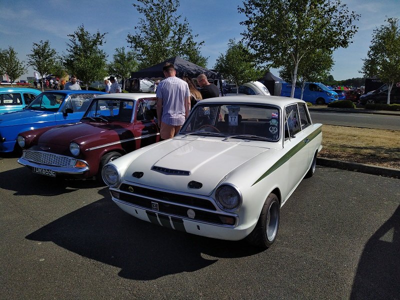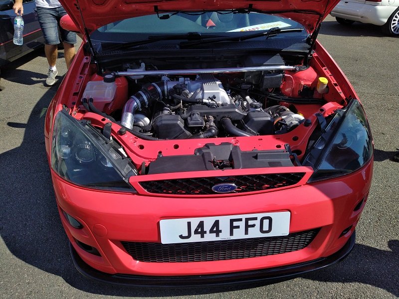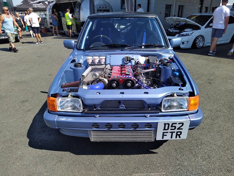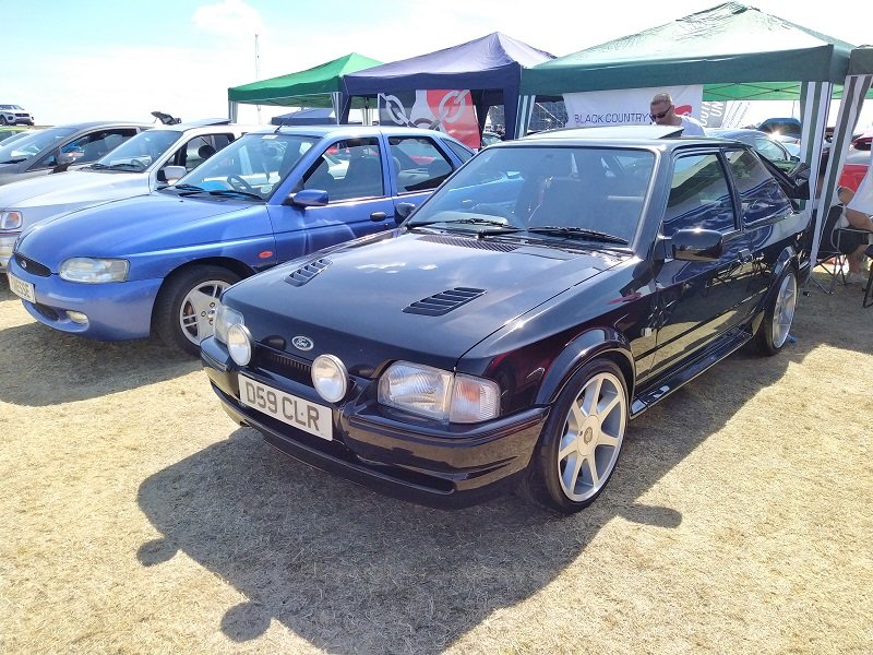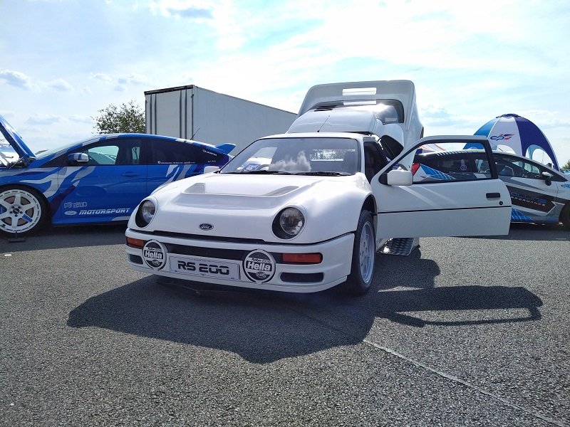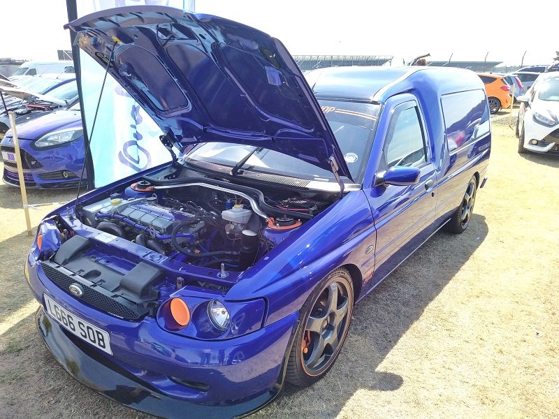 Jízdy pokračovaly během celého dne, takže jsme šli dál po okruhu sledovat, co vše ještě můžeme vidět. Za zmínku stojí určitě stánek hlavního sponzora Mountune. Stály se tam velké fronty v turniketech na prodej dílů - a že to tam chvíli vypadalo, jako kdyby ty věci dávali zadarmo. Za menším hloučkem lidí - závodní verze Ford RS200. Jdeme dále - nacházíme místo se stánky s občerstvením a autokosmetikou. Před ním stojí stará hranatá Fiesta - s motorem YB Cosworth a Turbem T04, přestavěnou na zadní náhon. Majitel patrně šílenec. Asi po další půlhodině procházení mezi zajímavými kousky, které byly různě zatoulané - jako třeba pár Focusů RS MK1, které nestály u hlavního dvojřadu. Co jsme tak pochopili, tak jsou určité zóny, kde jsou určitá auta pospolu a pak ještě zóny, kde jsou kluby. Takže proto se kolikrát objevily auta různě rozházená. Ale bylo to svým způsobem takové pestřejší a vlastně dopředu nikdo nevěděl, co tam bude stát. Po chvíli vidím první Sierru RS Cosworth v bílé barvě a 3dveř s ploutví. Není to RS500, ale první civilní třídveř. Vedle něj Saphire RS Cosworth. Oba kousky přepečlivě umyty a naleštěny. Kousek od těchto krásných kousků procházíme místem, kde byla burza s díly, stánky s různým oblečením, nálepkami, kosmetikou, díly, modely autíček až po občerstvení. Na chvíli odběhnul Mates - ikdyž tam nebylo tak přelidněno jak jsem čekal, během pár vteřin byl pryč. Za chvíli se objevil, drapnul mě a že se asi poseru! - No skoro ano, Ford Capri, ale překopaný dobovým týmem DRM (předchůdci DTM) Zakspeed. Takže na place stál Ford Capri Zakspeed Turbo. Upřímně bych tohle čekal spíše mimo Anglii, ale tohle mě dostalo! Byly dvě varianty motorů - 1,4 Turbo 480koní 9200 ot/min a 1,7 Turbo něco přes 600koní a stejně točící se nesmysl...Přiznám se, že nevím která jednotka v tom byla, ale bylo to šílené, vidět to na vlastní oči a z blízka. Auto z trubek o váze kolem 800kg s takovým výkonem. Masivní bodykit a pod dlouhou kapotou malý brutální mixér, který ve své době neměl konkurenci. Takže zase zpět nohama na zem a jde se dál. O kousek dál nám zase předvedli angličani zlaté ruce a lidovou tvořivost. Focus RS MK2 Cabriolet... To už se po sobě díváme, jestli nemáme úpal, ale tam to asi krom nás 4 nikoho ze židle nezvedalo. Pomalu jsme dostávali hlad, takže jsme se odebrali směrem ke stánku. Po cestě nacházím první Sierru RS500 Cosworth v originál verzi, ale místo T04 bylo turbo Borg Warner. Přicházíme ke stánkům na anglický cheesburger, který byl snad asi nejlepší, jaký jsem kdy jedl, až na uřvanou prodávající, která byla jako papoušek a v okruhu stánků jsme slyšeli jen ji a její " Next please! " . Nicméně sedímena u stolu a díváme se na Mustang Shelby GT500 Eleanor...Po jídle jsme pokračovali v procházce dále. Na jednom place bylo asi 20kousků Fiesty ST200 v šedé barvě. Po cestě vidíme palouk, kde z dálky září oranžová asi 80ks ST Focusů MK2 a MK3, nacházíme Escorty, Mondea, Escorty ve verzi kurýr, Sierru pickup. Mondea ST220....bylo toho tolik, že se to nedalo ani všechno zapamatovat a fotit.