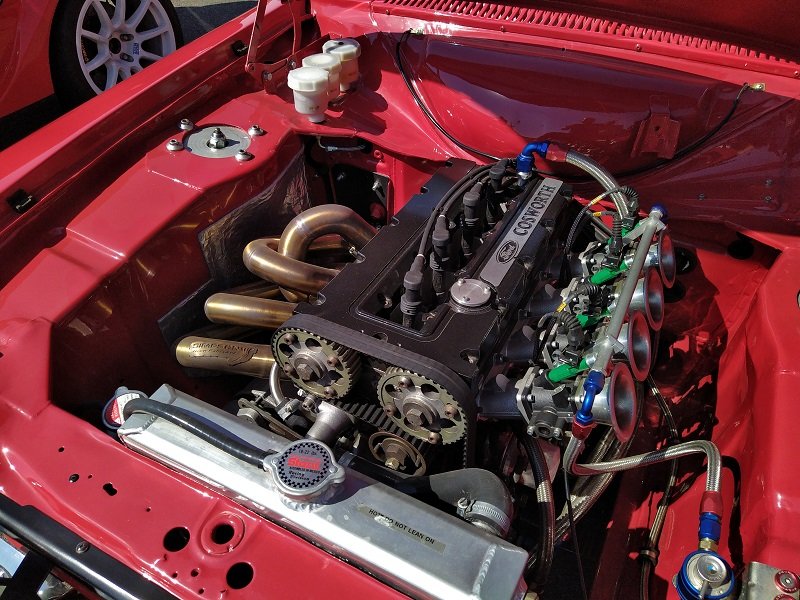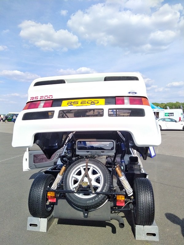 Pořád mě to ale táhlo opětovně do depa. Po cestě do depa vidíme stát bílý Escort RS Cosworth a červený Escort RS Cosworth upravovaný od italského specialistu na Cosworthy Oppligera s hodně velkým turbem Borg Warner. Dále na place stojí ona známá placka, bestie skupiny B. Ford RS200 - kdo by byl překvapen, samozřejmě na značkách. Také jsme našli místní zběsilý Focus Mk1 Combi od Howea. Překopaný na 1,6 EcoBoost z Fiesty. Auto hodně zajimavé z blízka a hodně fungující na trati. Teda, když zrovna jede, protože chudáka Howea dotáhli před depo po tom, co totálně rozthal přední slick. Takže se vyměnilo kolo a pokračoval v další jízdě. Na place jsme viděli další zajímavý projekt. Focus MK1 ST170 - přestavěný bodykitem na RS. Motor 4,0 V8 Toyota/Lexus, dvě turba Td04 z Volva S60, převodovka z BMW a zadní náprava z Nissanu 350z s diferenciálem s omezeným prokluzem. Výfuky v prahu před zadním kolem a to vše v červené barvě, a ano, na značkách.