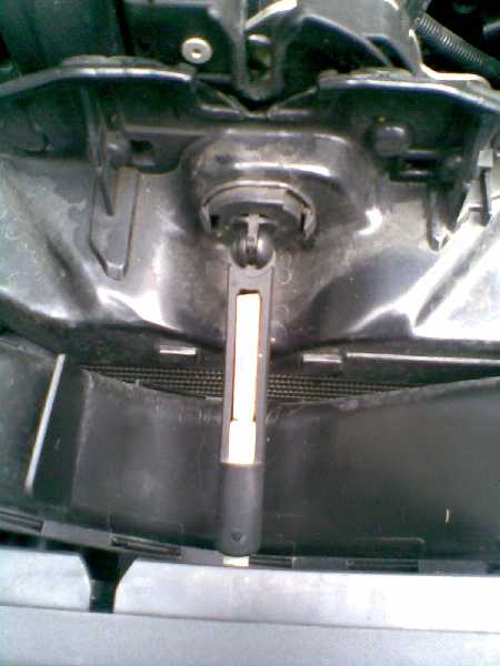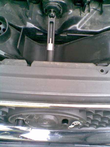 Po otvorení kapoty mám rovno nad chladičom umelohmotný kryt prichytený 4 skrutkami. Kryt treba dať dole. Pod krytom je vidieť tiahlo, ktoré ide od zámku k mechanizmu zamykania kapoty. Ja ho mám dvojfarebné. Vonkajšia časť je čierna a vnútorná časť je biela. V čiernej časti je priestor, v ktorom je uložená biela časť, avšak ten priestor je o niečo vačší ako biela časť a tak tam zostala medzera. Do tejto medzery som vložil drievko, ktoré malo šírku ako biela časť a po vložení zaplnilo celú medzeru. Teda účelom je zaplniť tú medzeru.